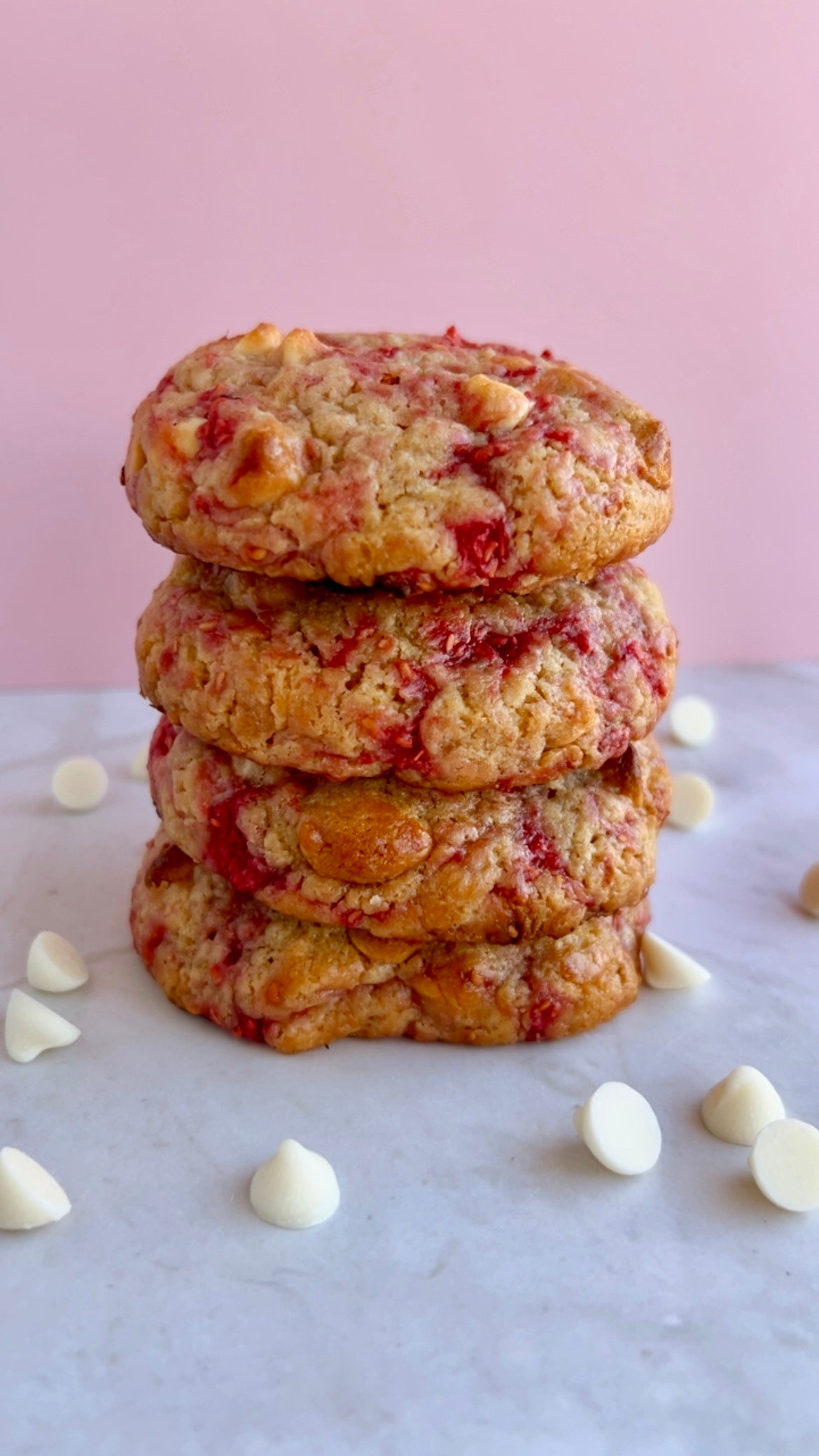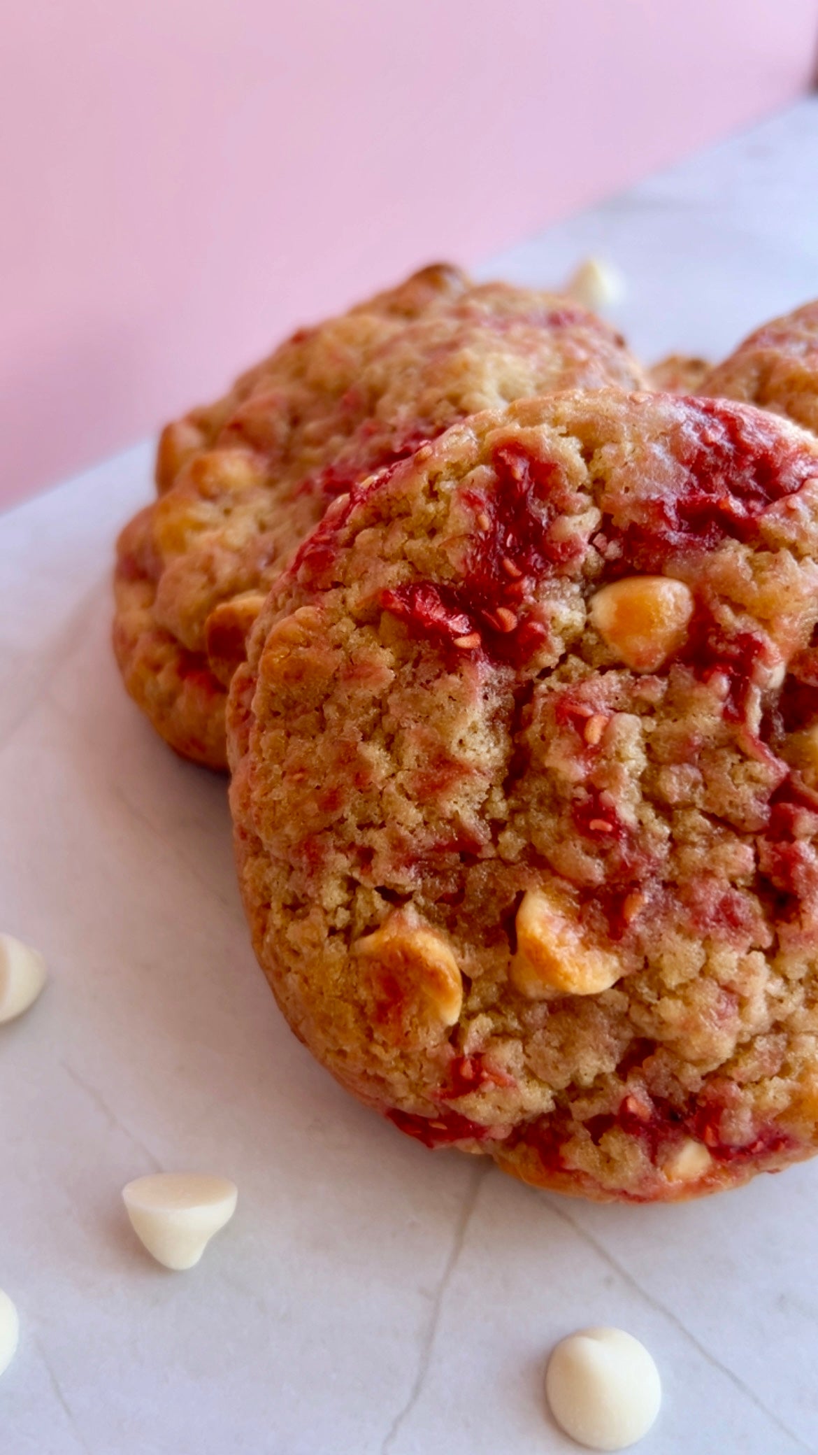 - Raspberry White Chocolate - a deliciously tart + sweet cookie filled with raspberries and white chocolate chips